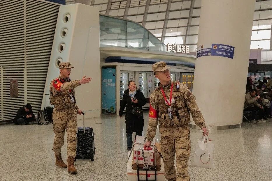 “看着车站候车大厅里人头攒动,难免也想我们的家人。”刘远安的家远在广西,入伍近8年,与家人总是聚少离多。谈起这个,他的话语中有遗憾,但更多的是坚定,“虽然我们没回家,但看着旅客们能安全返乡,我们心里也高兴!”